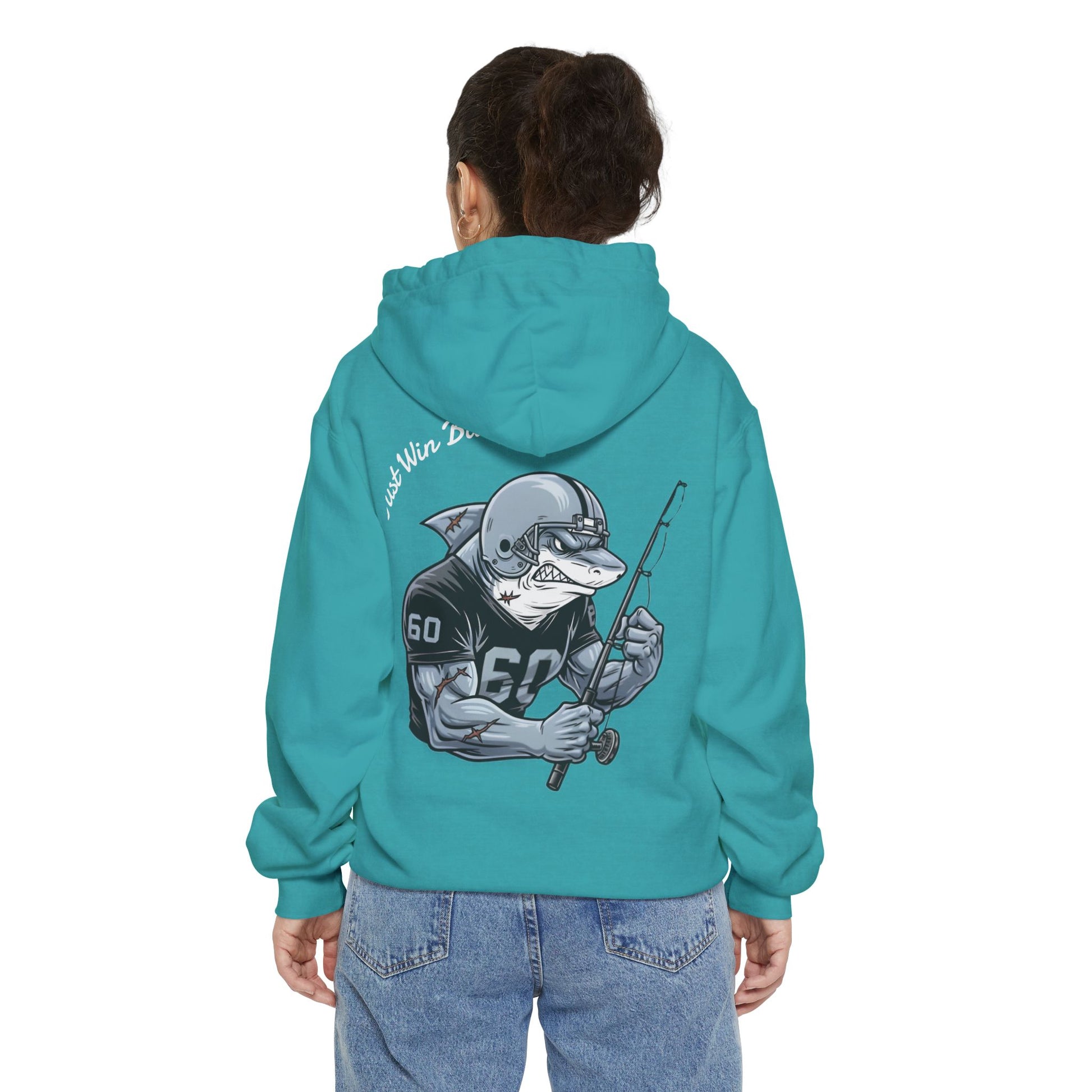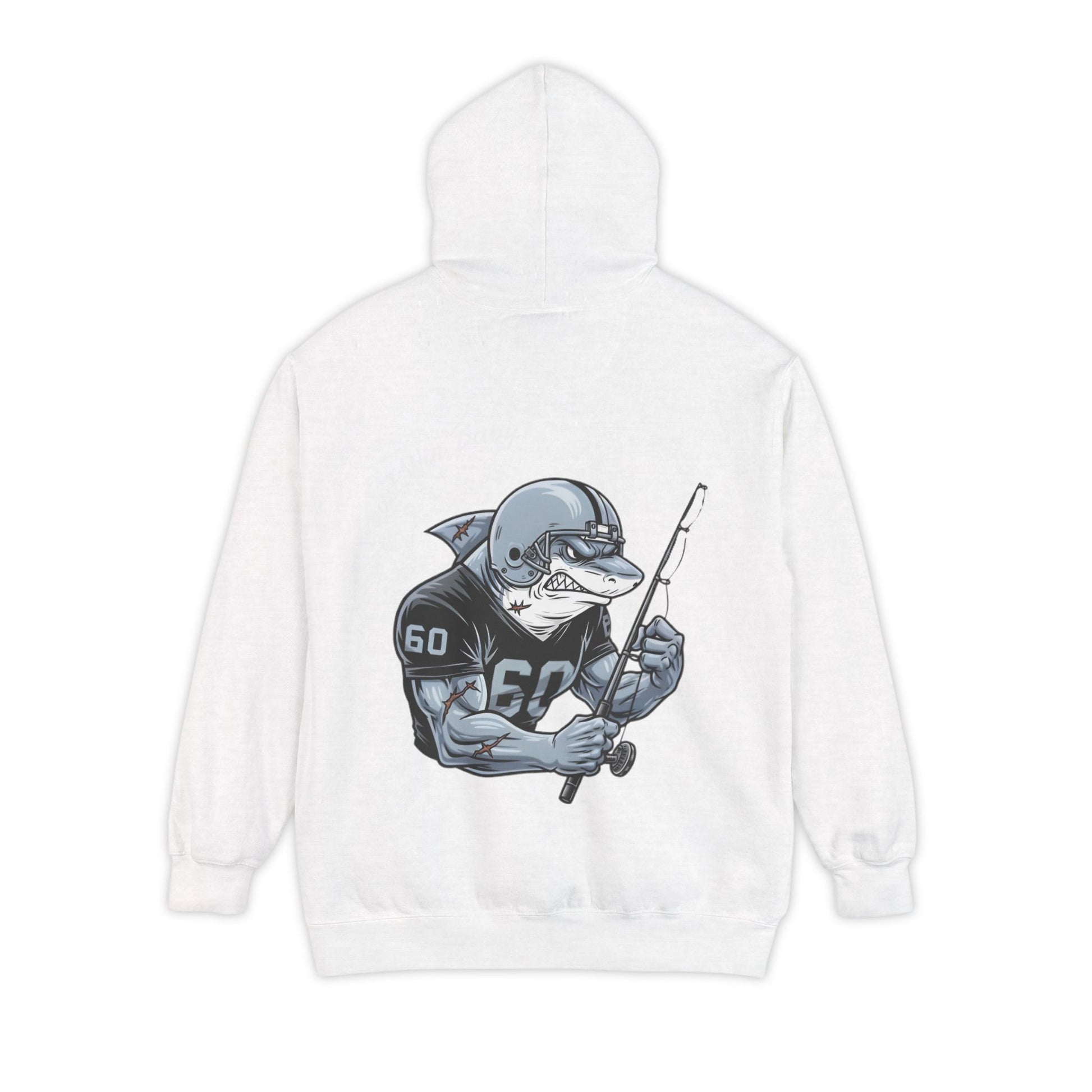 This hoodie features the "Enforcer" Bull Shark, a scarred-up veteran of the deep wearing the iconic silver helmet and black jersey. It's rendered in our signature vintage comic-book style with heavy linocut textures that look like they were carved out of a ship's hull.